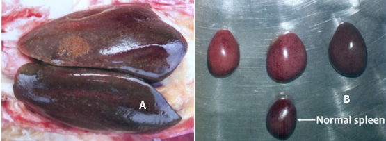 + In turkey: enlarged liver, spleen and kidneys. Pale body.