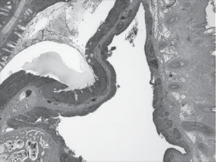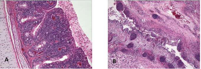 Microscopic pathology: Microscopic pathology caused by M. gallisepticum infection in chickens and turkeys is characterized by marked thickening of the mucous membranes of affected respiratory tract tissues as a result of infiltration with mononuclear cells (primarily lymphocytes) and lymphoid follicle hyperplasia. Metaplasia of the respiratory epithelium from pseudo‐stratified ciliated columnar to nonciliated low cuboidal or squamous has been described. Increased tracheal mucosal thickness is commonly used as a measure of M. gallisepticum disease severity. Lungs may have pneumonic areas, lymphofollicular changes, and granulomatous lesions. Detailed examinations of M. gallisepticum‐infected chicken air sacs via light microscopy, scanning electron microscopy, and histomorphometric evaluation have been published. Keratoconjunctivitis in layer chickens associated with M. gallisepticum infection is characterized by epithelial hyperplasia, marked lymphocytic infiltration with the formation of germinal centers, and subepithelial edema, resulting in marked thickening of the eyelids.