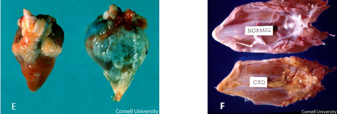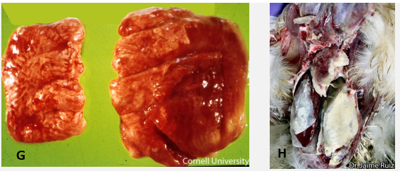 Chickens: M. gallisepticum typically infects most chickens in a flock, but clinical disease is variable in severity and duration. It tends to be more severe during the cold months and in younger birds, although there may be significant egg production losses in laying flocks. Although M. gallisepticum is considered the primary cause of CRD, other organisms frequently cause complications, precipitating severe air sac infection, often designated complicated CRD or “air sac disease.” Field or live vaccine strains of Newcastle disease or infectious bronchitis viruses may exacerbate M. gallisepticum infection, which is frequently complicated by E. coli. Concurrent infections with turkey rhinotracheitis virus in turkeys and low pathogenic avian influenza virus in chickens also resulted in more severe M. gallisepticum disease. Mortality may be negligible in adult laying flocks, but there can be a reduction in egg production. In broilers the mortality may range from low in uncomplicated disease to as much as 30% in complicated outbreaks, especially during the colder months. Retarded growth and carcass condemnations, and downgrading at processing constitute additional losses.