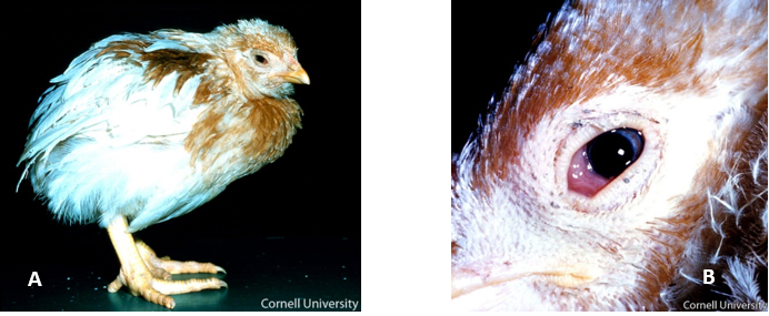 Chickens: The most characteristic signs of naturally occurring M. gallisepticum disease in adult flocks are tracheal rales, nasal discharge, and coughing. Feed consumption is reduced, and birds lose weight. In laying flocks, egg production declines but is usually maintained at a lowered level. However, flocks may have serologic evidence of infection with no obvious clinical signs, especially if they are recovered carriers. Male birds may have the most pronounced signs, and the disease is often more severe during winter. Severe outbreaks with high morbidity and mortality observed in broilers are frequently caused by concurrent infections and environmental factors. Cases of keratoconjunctivitis caused by M. gallisepticum infection in commercial layer pullets were characterized by facial and eyelid swelling, increased lacrimation, and conjunctival congestion (McMullin 2020).