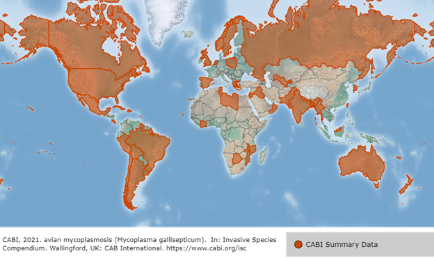 M. gallisepticum can be found worldwide in poultry. The M. gallisepticum lineage maintained in finches was first reported in the eastern US in the mid-1990s. Since that time, it has since spread to much of the U.S. and parts of Canada. M. gallisepticum infections have also been reported in wild birds in other regions, such as Europe and Asia. However, there is currently no evidence that the house finch lineage occurs outside North America.