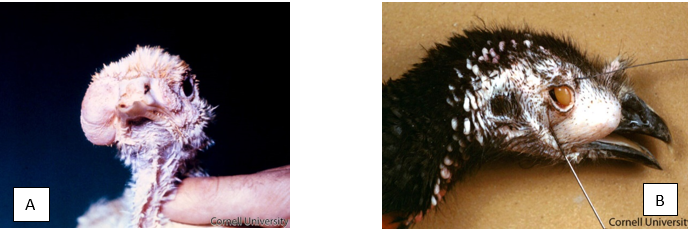 Turkeys: Turkeys are more susceptible to M. gallisepticum than chickens, commonly developing more severe clinical signs, including sinusitis, tracheal rales, coughing, dyspnea, listlessness, decreased feed intake, and weight loss. As in chickens, more severe outbreaks with high morbidity and mortality frequently follow the involvement of complicating factors such as colibacillosis or environmental stressors. Nasal discharge and foamy eye secretions often precede swelling of the infraorbital sinuses, which may result in partial to complete eye closure. Feed consumption may remain normal if sight is not affected, but progressive disease ultimately results in poor weight gain and weight loss. Encephalitic forms of M. gallisepticum have been reported in 8 to 16 weeks old commercial meat turkeys displaying torticollis and/or opisthotonos. In breeding flocks, there may be a drop in egg production (McMullin 2020).