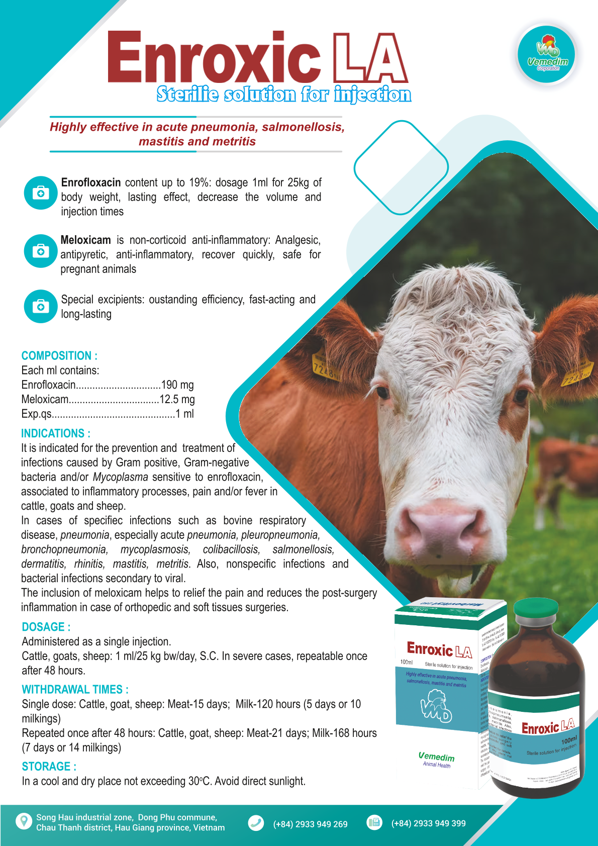 It is indicated for the prevention and treatment of infections caused by Gram-positive, Gram-negative bacteria, and/or Mycoplasma sensitive to enrofloxacin, associated with inflammatory processes, pain, and/or fever in cattle, goats and sheep.