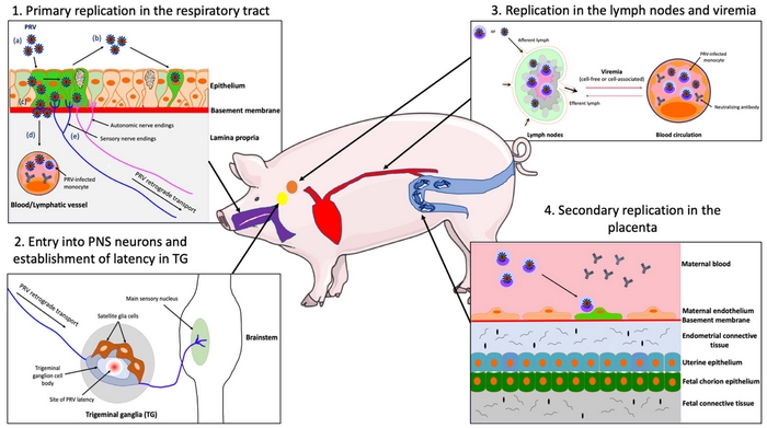 Virus xâm nhập cơ thể heo chủ yếu qua đường hô hấp, tiêu hóa, nhau thai hoặc giao phối. Sau khi vào cơ thể, PRV nhân lên nhanh chóng tại biểu mô đường hô hấp trên, rồi tấn công hệ thần kinh trung ương qua các dây thần kinh khứu giác và thần kinh sinh ba, dẫn đến viêm màng não không mủ và các rối loạn thần kinh nghiêm trọng.