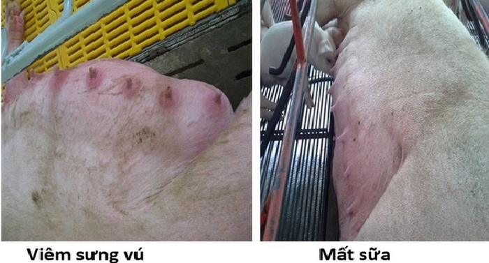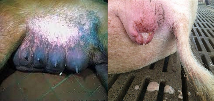 - Bầu vú sưng, nóng, đỏ, cứng, khi chạm vào heo phản ứng đau rõ rệt.