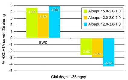 ALOAPUR® - một thành phần thức ăn hiệu quả có chứa lactylates (C12 và C14 lactylates), sau đây được gọi là sản phẩm lactylate, thúc đẩy sức khỏe đường ruột và hỗ trợ sức khỏe tổng thể của vật nuôi, cũng như cải thiện các yếu tố năng suất chủ yếu, như FCR và thể trọng. Công thức bột không dính, chảy tự do được cấp bằng sáng chế phù hợp để thực hiện trong cả hai là thức ăn hỗn hợp và thức ăn premix, với các lợi ích quan sát được trên một số loài bao gồm gia cầm, heo, thỏ, vật nhai lại và thủy sản. Thành phần này hoạt động bằng cách giúp chuyển đổi có chọn lọc hệ vi khuẩn ruột để tạo ra sự cân bằng có lợi hơn trong hệ vi sinh vật của vật nuôi này và cải thiện sức khỏe đường ruột. Ví dụ, nghiên cứu trên gà thịt chứng minh đã đạt được thể trọng tăng tới 4,9% và FCR đến -4,41% (Hình 2). Các nghiên cứu tiếp theo phân tích số lượng lactylate có trong các phần khác nhau của ruột đã tìm thấy sản phẩm lactylate ở nhiều vùng dọc theo đường tiêu hóa ở gà thịt được nuôi bằng thành phần này, cho thấy nó cân bằng hệ vi khuẩn đường ruột trong hệ vi sinh vật của vật nuôi, giúp cải thiện năng suất. Ngoài những lợi ích quan sát được đối với sức khỏe động vật, thành phần thức ăn còn thể hiện các tính chất vật lý tuyệt vời, bao gồm mùi trung hòa và ổn định nhiệt, làm cho nó trở thành một giải pháp hiệu quả, dễ dàng tích hợp vào các hỗn hợp và hợp chất thức ăn mới. Hơn nữa, các nhà sản xuất thức ăn có cơ hội tối ưu hóa sản phẩm của họ bằng cách kết hợp điều này với các thành phần thức ăn khác, chẳng hạn như tinh dầu, enzyme và các acid hữu cơ.