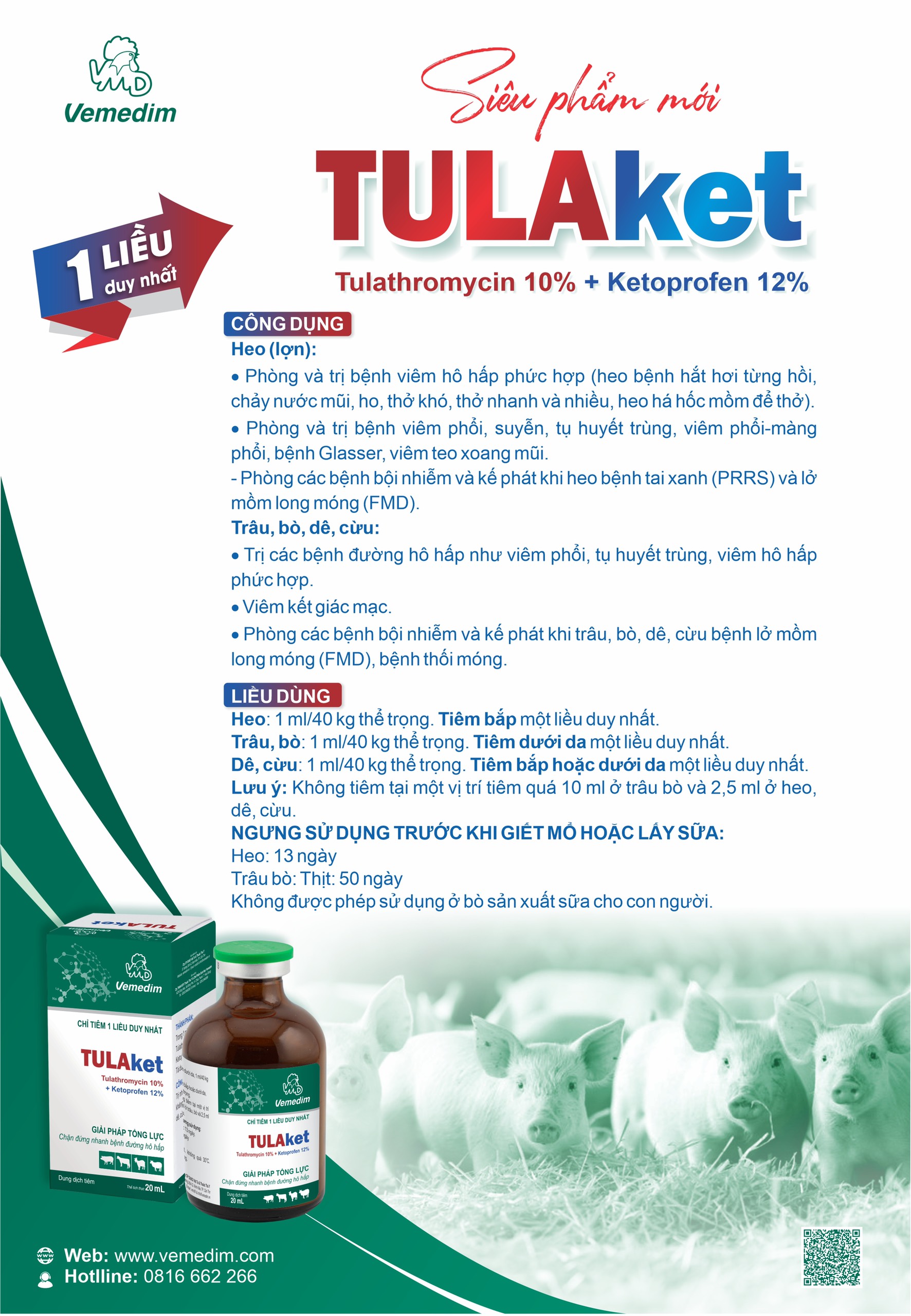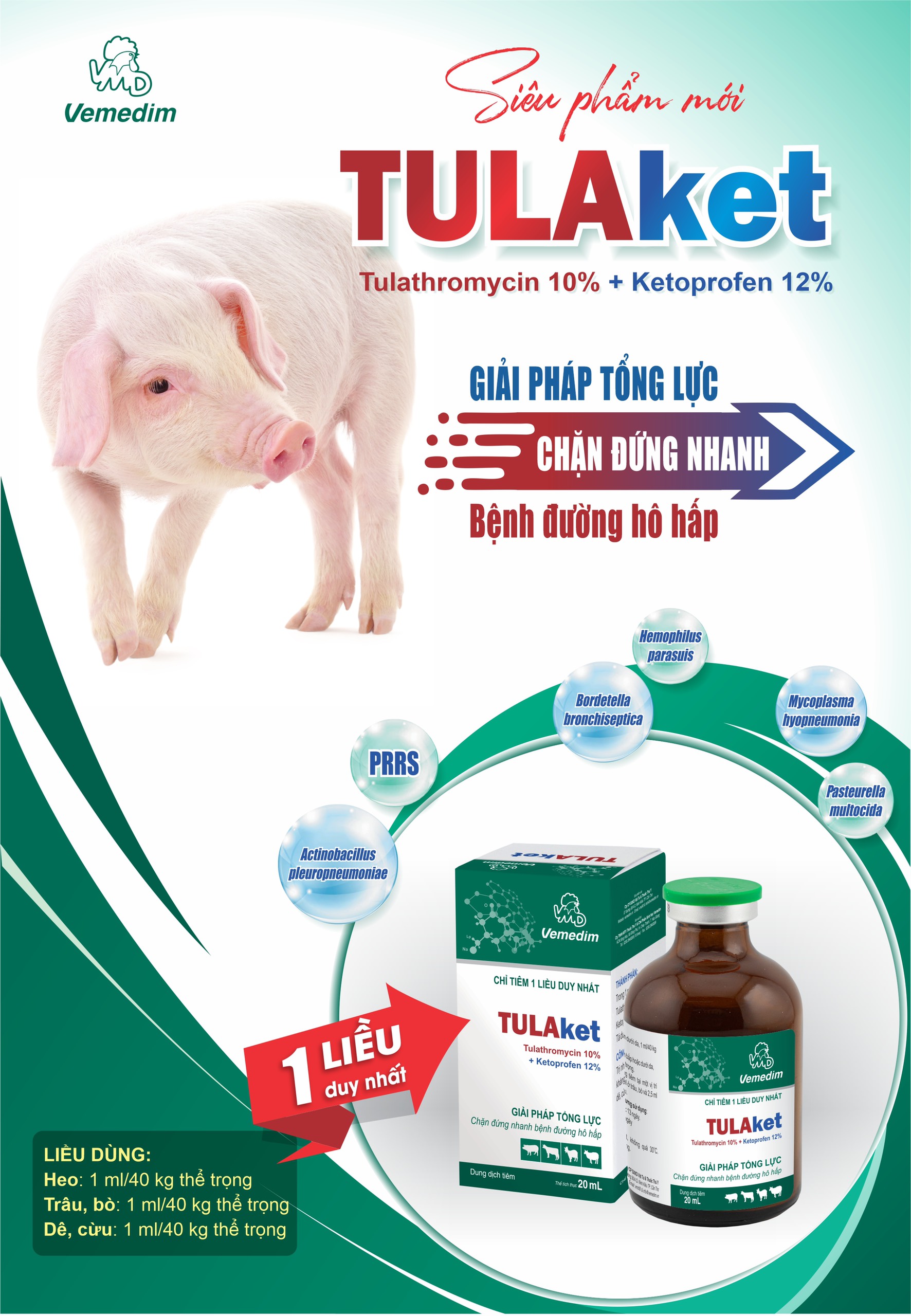 Trị nhiễm khuẩn đường hô hấp, kháng viêm trên trâu bò, heo, dê, cừu, chó, mèo, gia cầm.