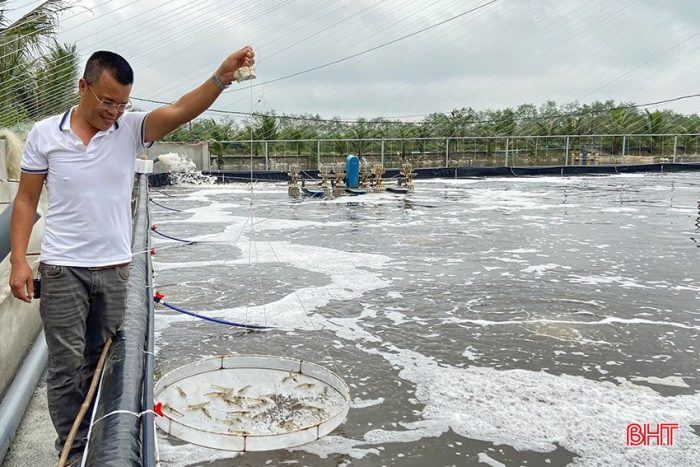 Sau khi tìm hiểu quy trình kỹ thuật từ nhiều địa phương, anh Đào Xuân Tĩnh (xã Yên Hòa, Cẩm Xuyên) đã quyết định đầu tư hơn 2 tỷ đồng để nâng cấp mô hình nuôi tôm siêu thâm canh 3 giai đoạn khép kín. Hệ thống ao trữ, xử lý nước được xây dựng bài bản trên diện tích hơn 2 ha. Hiện tại, anh Đoàn Xuân Tĩnh đã thả hơn 2 triệu con giống với kỳ vọng đạt 30 tấn/vụ.