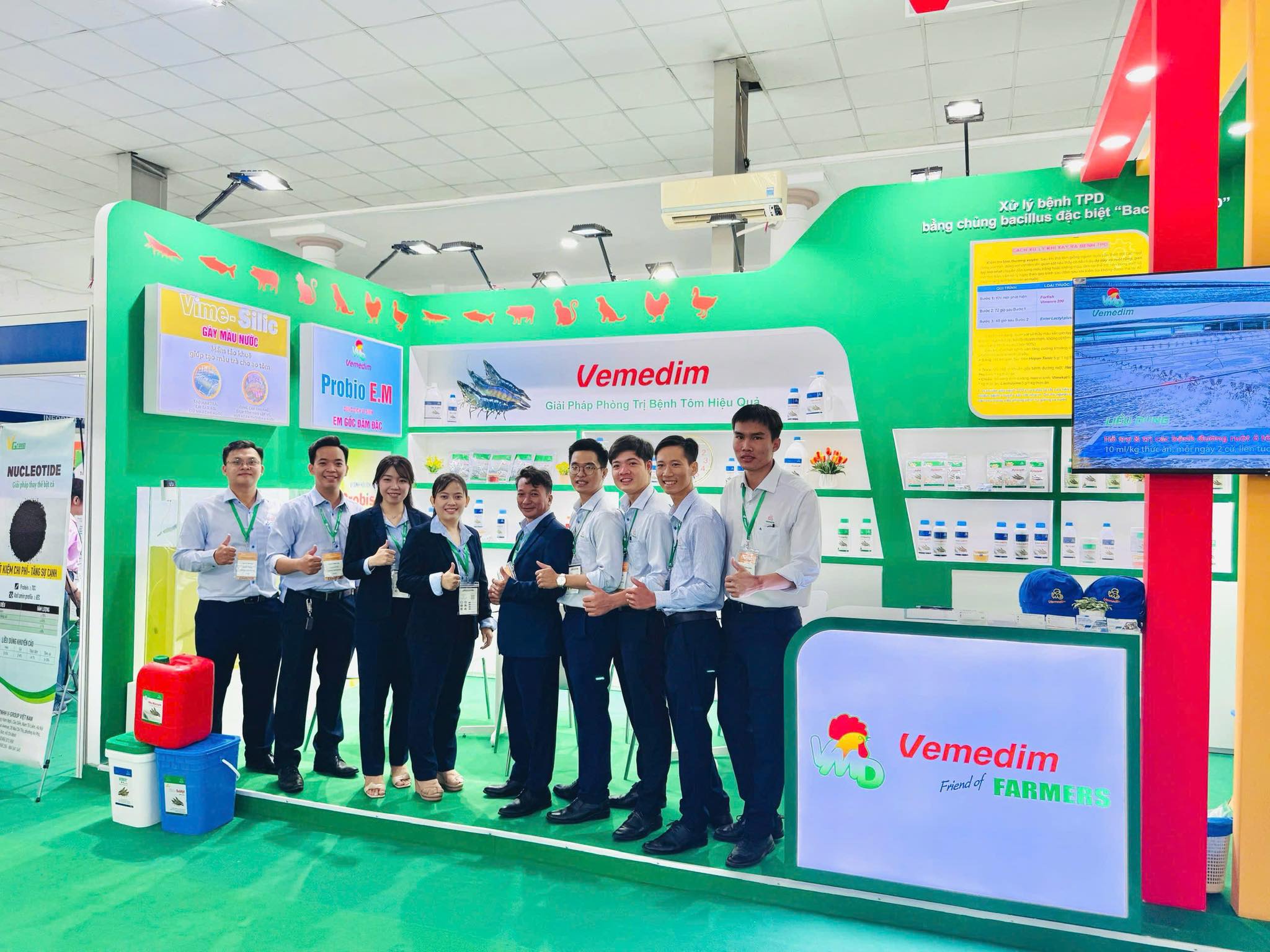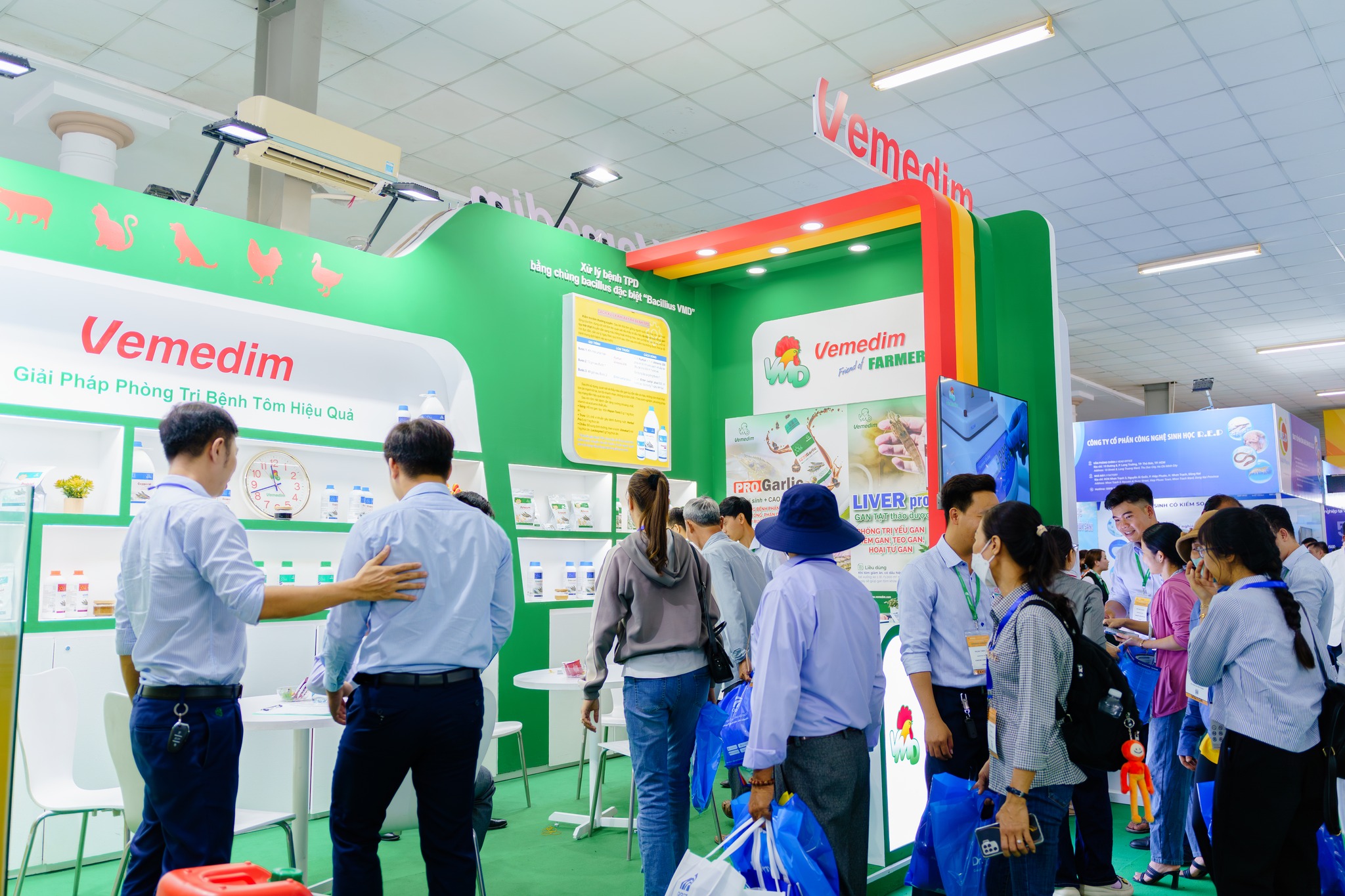 Tại Vietshrimp 2025, gian hàng Vemedim tọa lạc tại vị trí E4+5 đã thu hút sự quan tâm lớn nhờ thiết kế sáng tạo, chuyên nghiệp cùng không gian mở hiện đại. Gian hàng mang đậm dấu ấn thương hiệu Vemedim – nơi trưng bày các giải pháp toàn diện trong phòng và trị bệnh trên tôm, góp phần thúc đẩy nuôi tôm hiệu quả và bền vững.