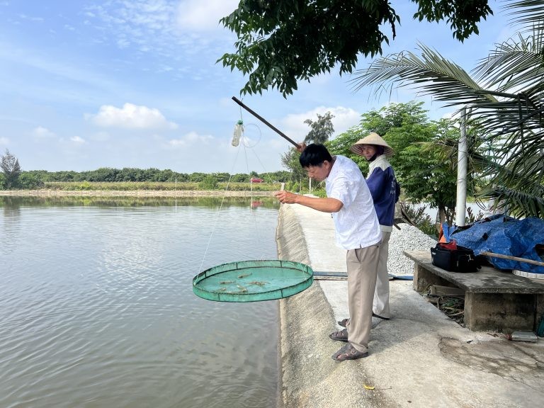 Để đảm bảo an toàn cho đàn tôm, ông Tùng thường xuyên kiểm tra ao, điều chỉnh lượng thức ăn, nhiệt độ và mực nước hợp lý. Theo ông, nắng nóng có thể làm nhiệt độ nước tăng cao, tạo điều kiện cho tảo và vi khuẩn có hại phát triển. Đặc biệt, khi đang nắng mà chuyển sang mưa dông, tôm dễ bị sốc nhiệt, suy giảm sức đề kháng và có nguy cơ nhiễm các bệnh nguy hiểm như phân trắng hoặc đốm trắng – bệnh có thể khiến năng suất giảm đến 70%.