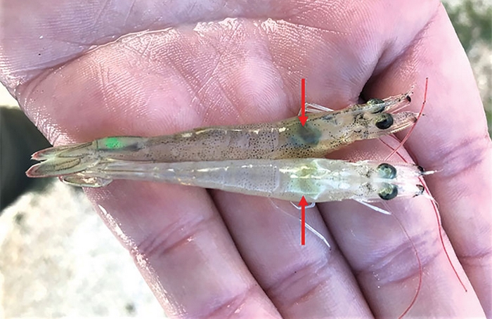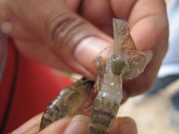 Khi so sánh với tôm khỏe, tôm bệnh có gan tụy vàng nhạt hoặc xám nâu, màu sắc không đồng đều. Nếu mổ kiểm tra, có thể thấy gan bị phá hủy từng phần hoặc toàn bộ – dấu hiệu đặc trưng của bệnh.