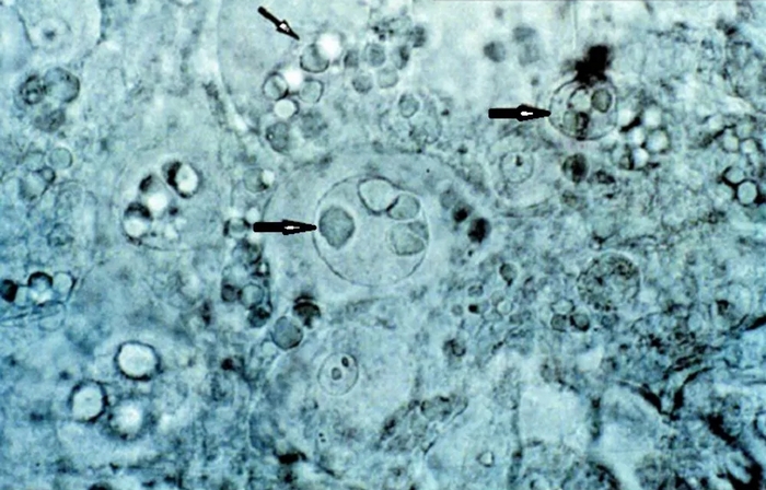 - Nhuộm Hematoxylin – Eosin: Thể ẩn màu đỏ thẫm, nhân tế bào màu xanh tím, tế bào chất màu hồng đến đỏ.