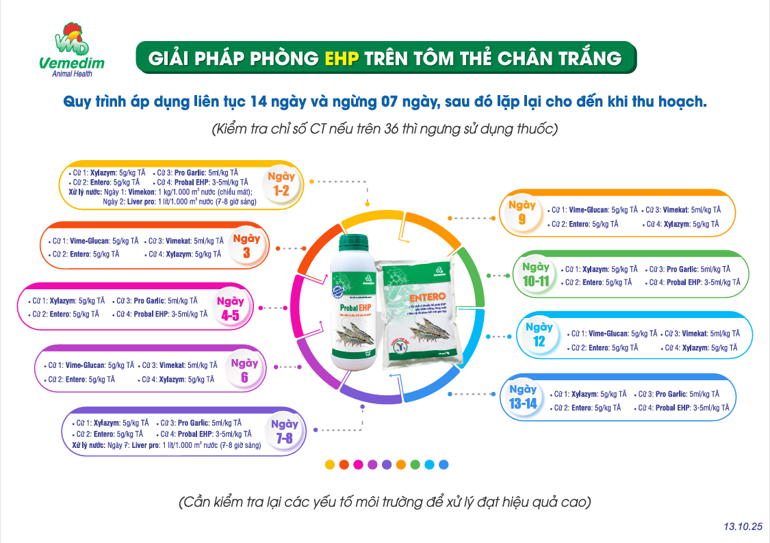 EHP tôm là bệnh do ký sinh trùng Enterocytozoon hepatopenaei (EHP) gây ra, khiến tôm chậm lớn, còi cọc và giảm khả năng hấp thụ dinh dưỡng. Bệnh này tấn công tuyến gan tụy của tôm và thường không gây chết hàng loạt, nhưng ảnh hưởng nghiêm trọng đến năng suất nuôi và giá trị thương phẩm do tôm phát triển không đồng đều. EHP có thể lây lan qua đường miệng và phân, nên việc phòng ngừa, kiểm soát bằng cách sử dụng giống sạch bệnh và vệ sinh ao nuôi là rất quan trọng.