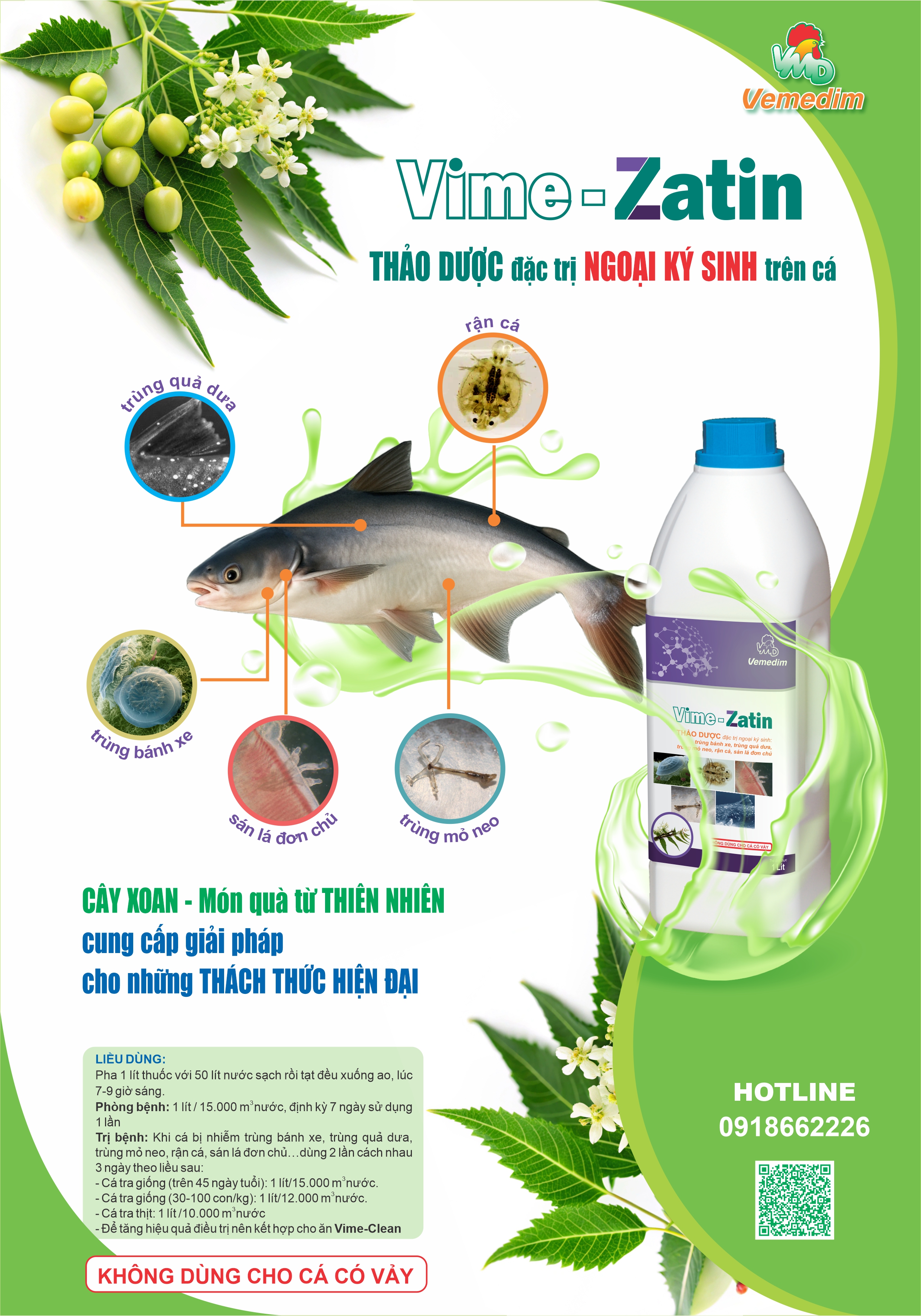 Vime-zatin - Trị bệnh trùng bánh xe, trùng quả dưa, trùng mỏ neo, rận cá, sán lá đơn chủ, vi bào tử trùng trên cá tra, ba sa.