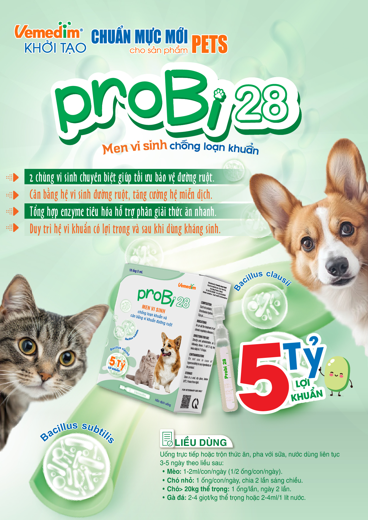 Lần đầu tiên, Vemedim giới thiệu Probi 28 – men vi sinh dạng ống chứa 5 tỷ lợi khuẩn, ứng dụng công nghệ vi sinh chuyên biệt dành riêng cho thú cưng. Đây không chỉ là sản phẩm mới, mà là một bước tiến đột phá trong việc bảo vệ và chăm sóc hệ tiêu hóa cho chó mèo.
