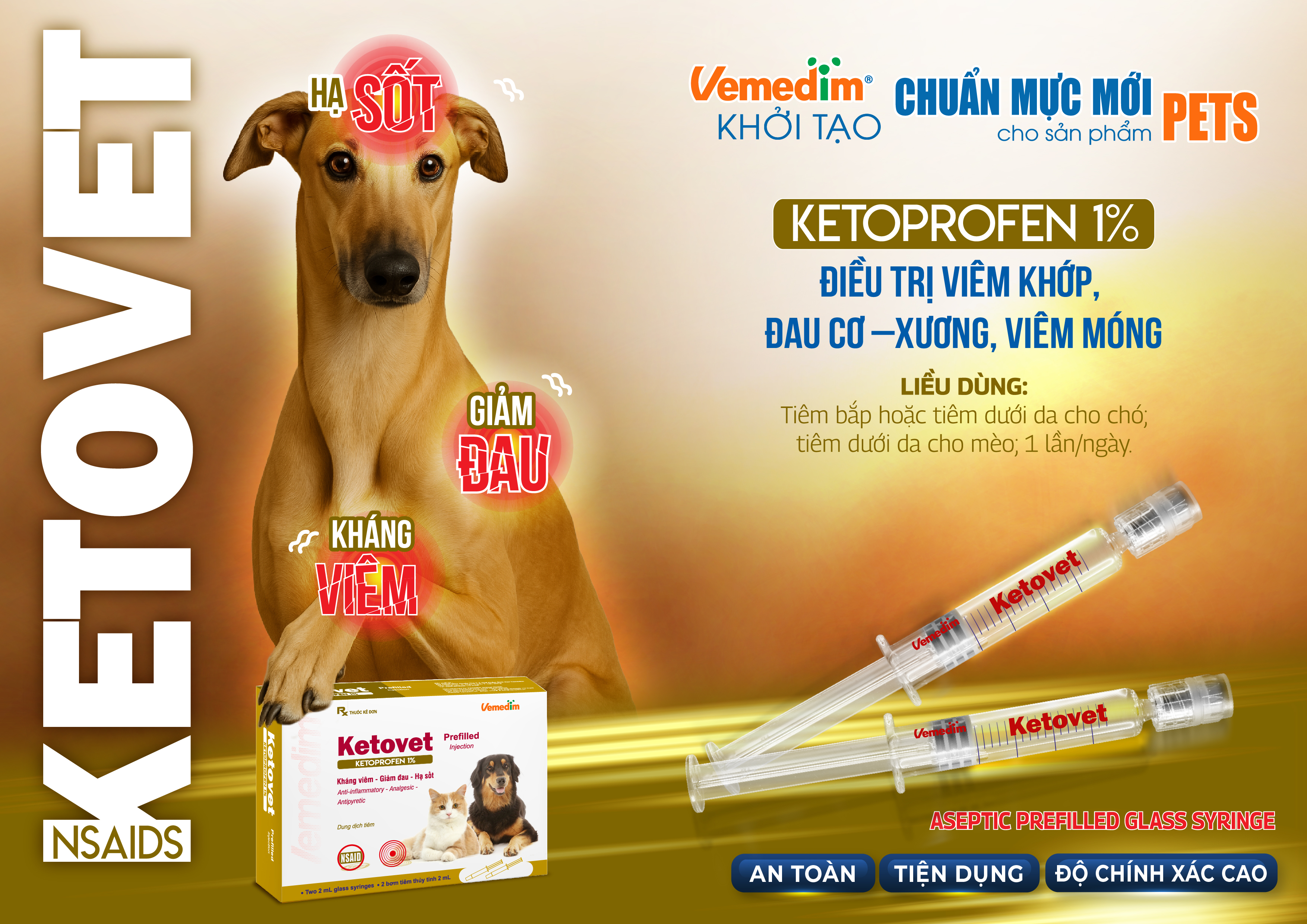 👉 Đừng lo, đã có Ketovet Pet – thuốc tiêm 1 lần dùng, chứa ketoprofen 20mg, chuyên biệt cho chó mèo với công dụng: