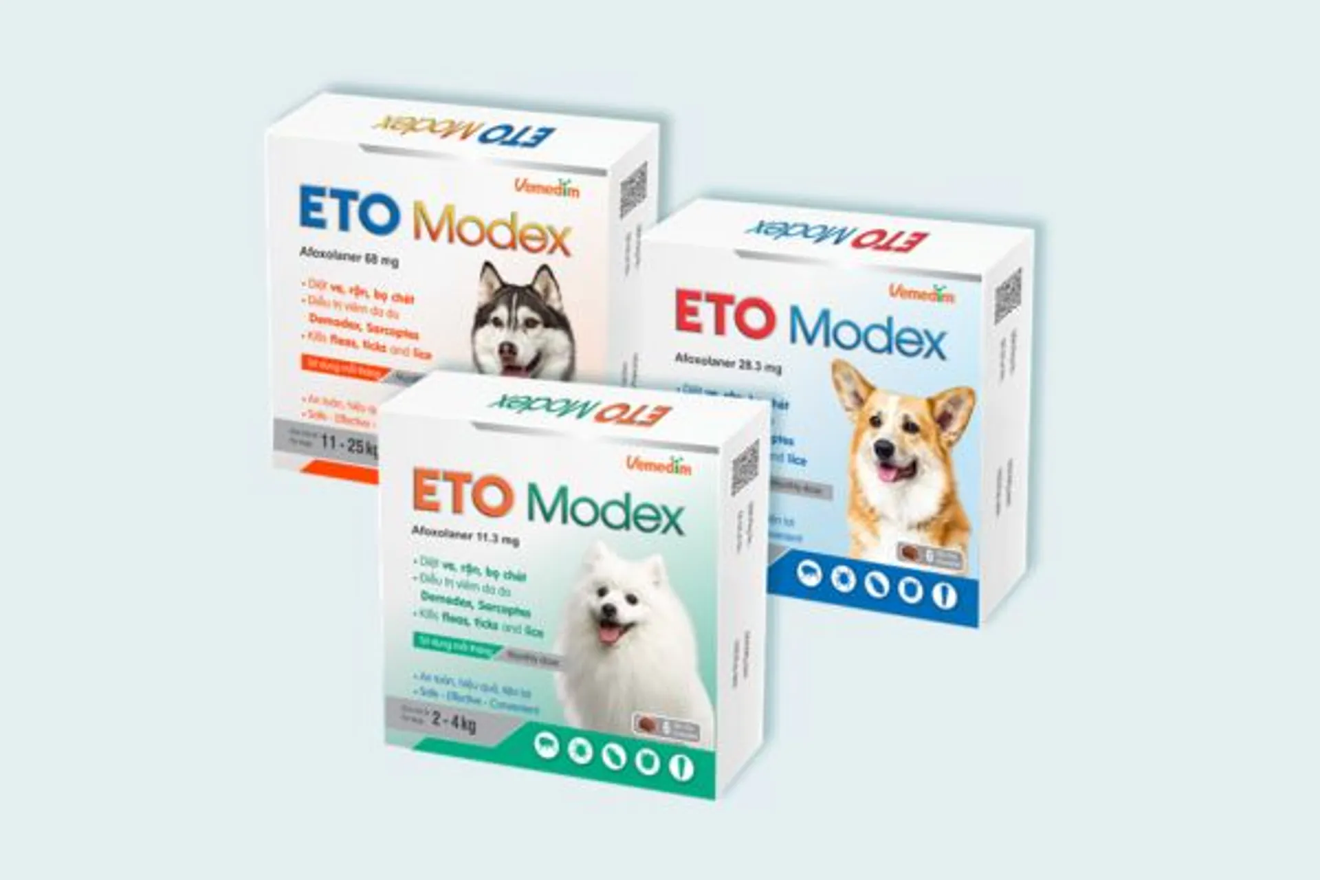 - Sản phẩm tiêu biểu ETO Modex: Trong danh mục sản phẩm của mình, Vemedim tự hào giới thiệu ETO Modex – dòng thuốc nhỏ gáy thế hệ mới với hiệu quả vượt trội. Sản phẩm giúp tiêu diệt nhanh chóng bọ chét, ve rận và hỗ trợ kiểm soát các bệnh ký sinh trùng da một cách an toàn, duy trì hiệu lực bảo vệ kéo dài cho thú cưng.
