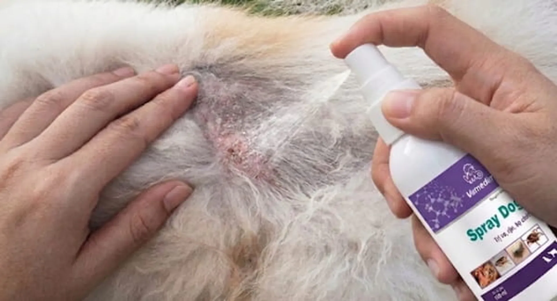 - Sát trùng vết thương hở: Nếu da chó xuất hiện mụn mủ hoặc bị trầy xước do gãi, việc sát trùng là bắt buộc để tránh nhiễm trùng máu. Bạn có thể sử dụng dung dịch sát khuẩn như Vime-Blue để xịt trực tiếp lên vết thương, giúp vết thương mau khô và ngăn ngừa vi khuẩn xâm nhập.
