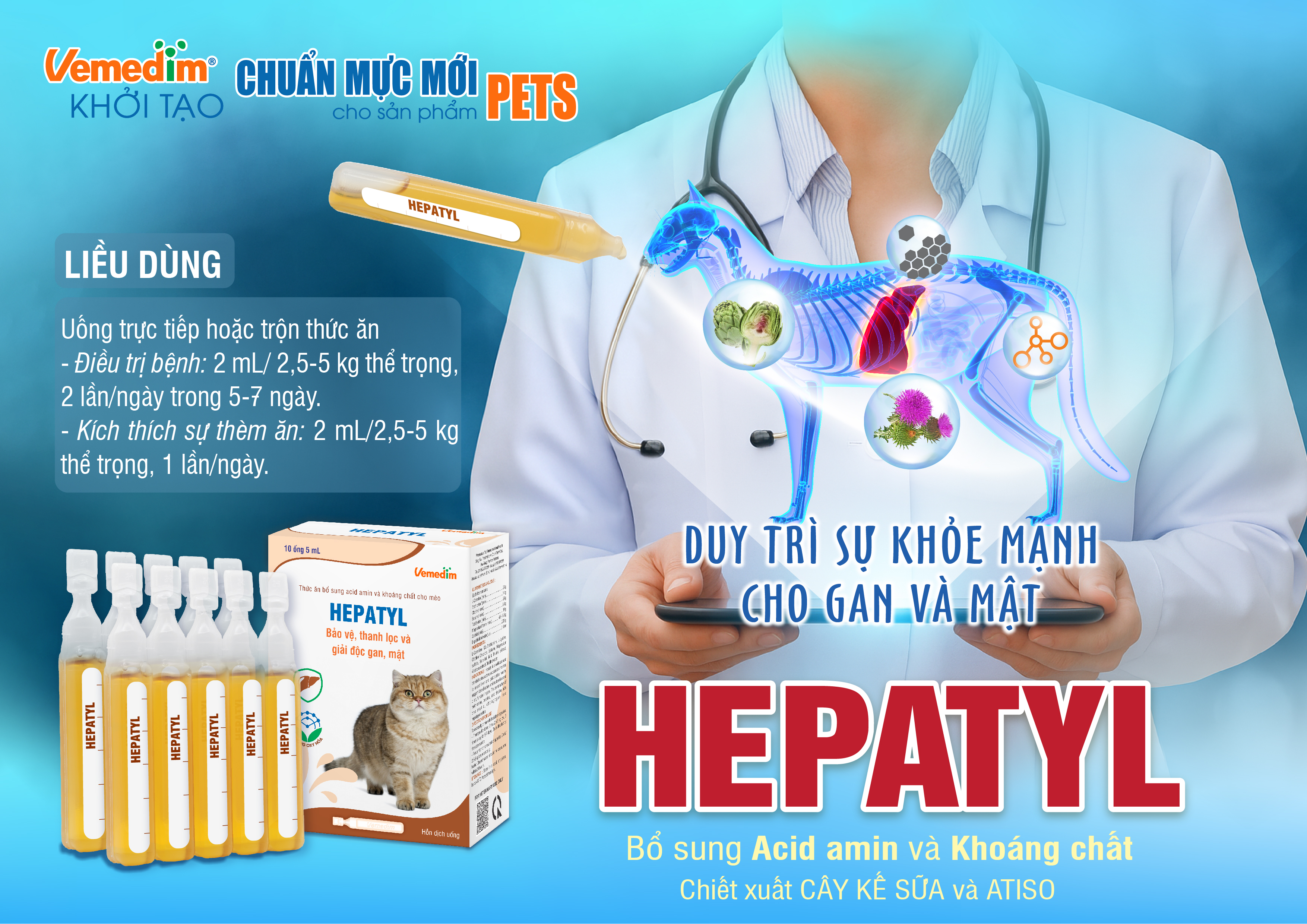 Hepatyl là sự kết hợp cân bằng của nhiều hoạt chất giúp duy trì sự khỏe mạnh cho gan mật, hỗ trợ thải độc và phục hồi chức năng gan mật trên thú cưng. Sự kết hợp của methionine, betaine và choline giúp lợi mật, thông mật, bảo vệ gan.