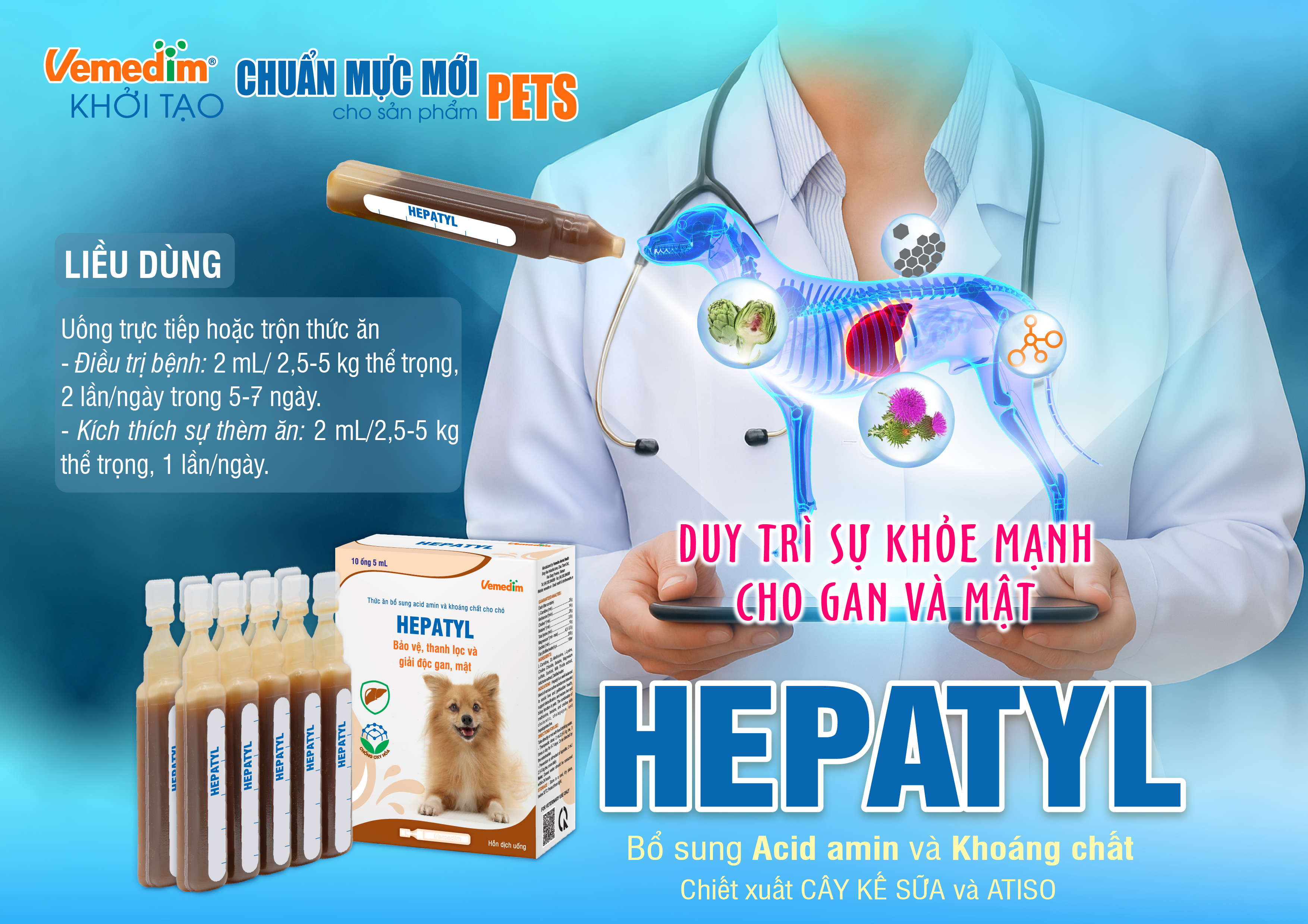 Hepatyl là sự kết hợp cân bằng của nhiều hoạt chất giúp duy trì sự khỏe mạnh cho gan mật, hỗ trợ thải độc và phục hồi chức năng gan mật trên thú cưng. Sự kết hợp của methionine, betaine và choline giúp lợi mật, thông mật, bảo vệ gan.